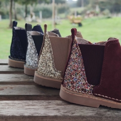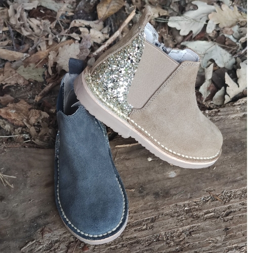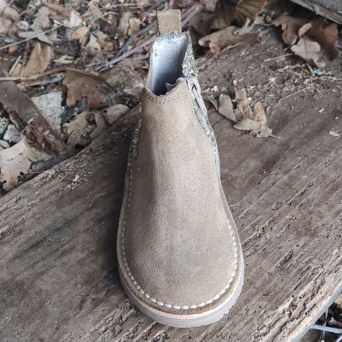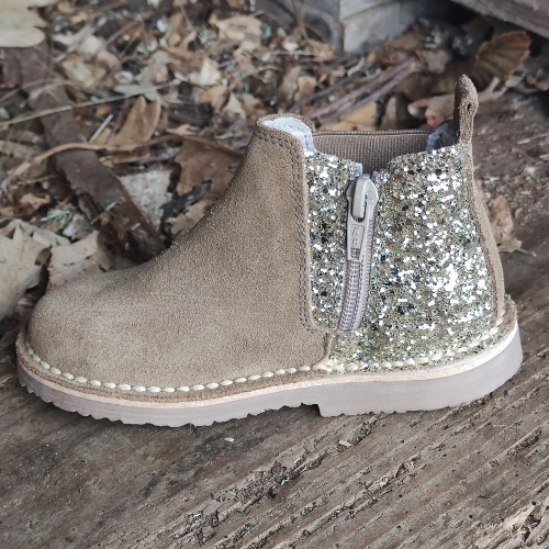 Botín realizado en piel serraje con forro interior en piel, parte trasera con adorno de glitter al tono.