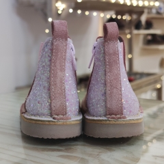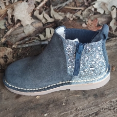 Botín realizado en piel serraje con forro interior en piel, parte trasera con adorno de glitter al tono.