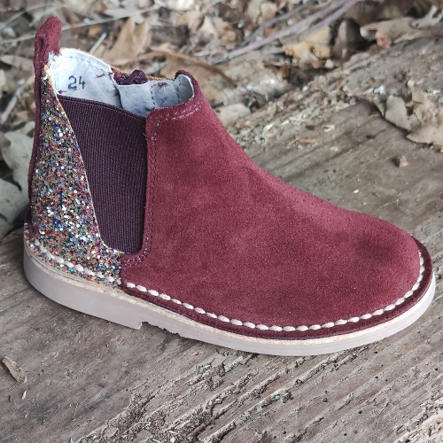Botín realizado en piel serraje con forro interior en piel, parte trasera con adorno de glitter al tono.