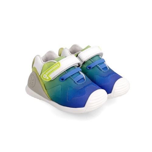 Deportivo Biomecanics verde y azul, exterior combinado en piel y textil, interior forrado en piel microperforada, con puntera reforzada para un super trote diario, suela de goma muy flexible y antideslizante.