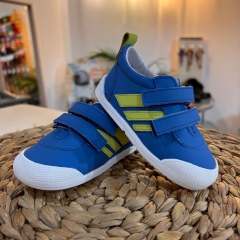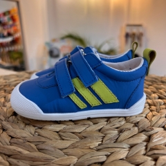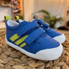 Deportiva azul nobuck con rayas laterales blancas, respetuosa con el pie de los más pequeños. Suela plana (sin drop), muy ligera y antideslizante.