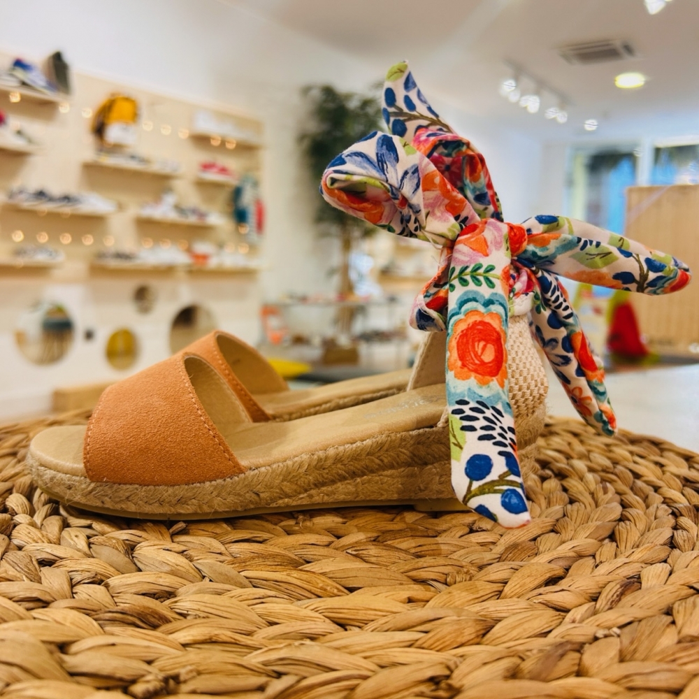 Sandalia esparto con parte delantera en serraje y trasera con lazo estampado. Suela con una pequeña cuña.