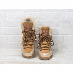 Bota realizada en piel de serraje ecológica combinada con piel brillante de calidad premium. Cierre con cordones de algodón, forro interior de piel de cordero.