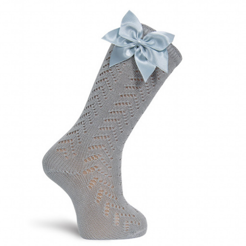 Calcetín perlé con calado en forma de espiga y lazo lateral.