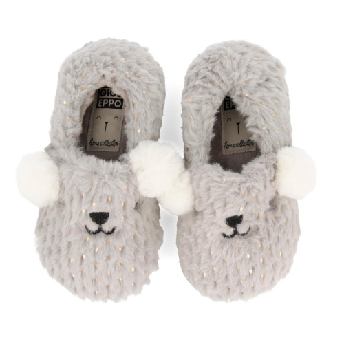 Zapatillas de casa en tono gris, lleva una cara en la parte delantera y dos pompones a los laterales, suela de goma antideslizante y muy blandita.