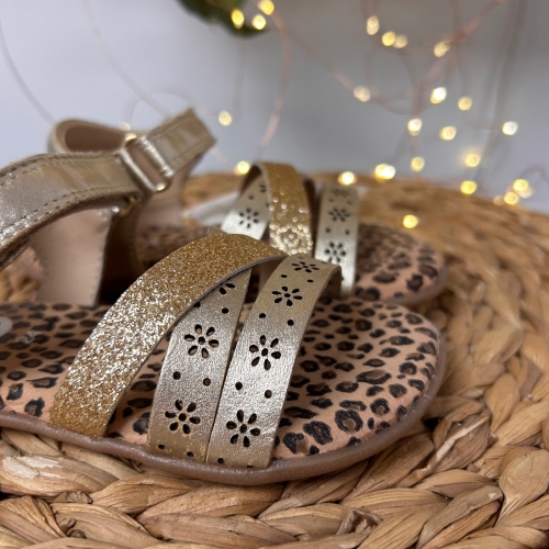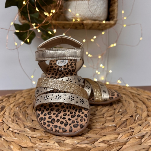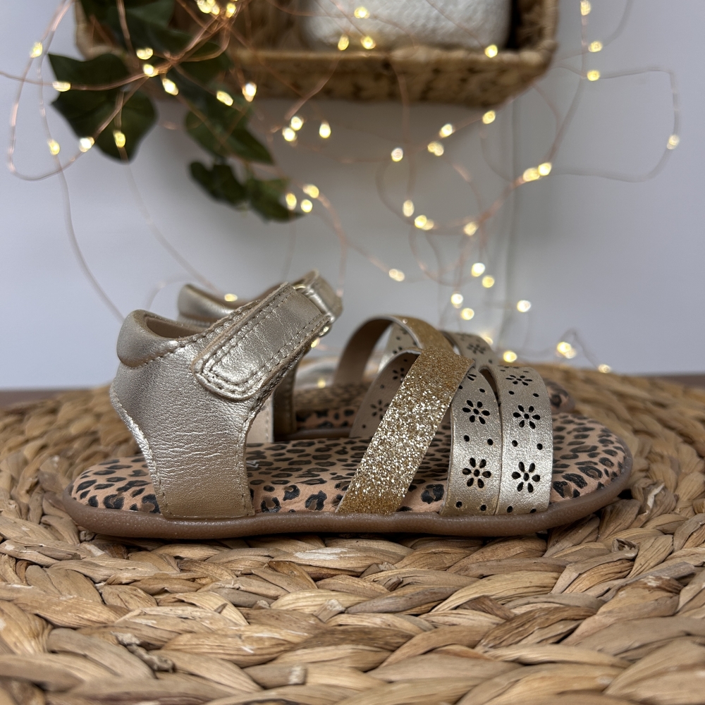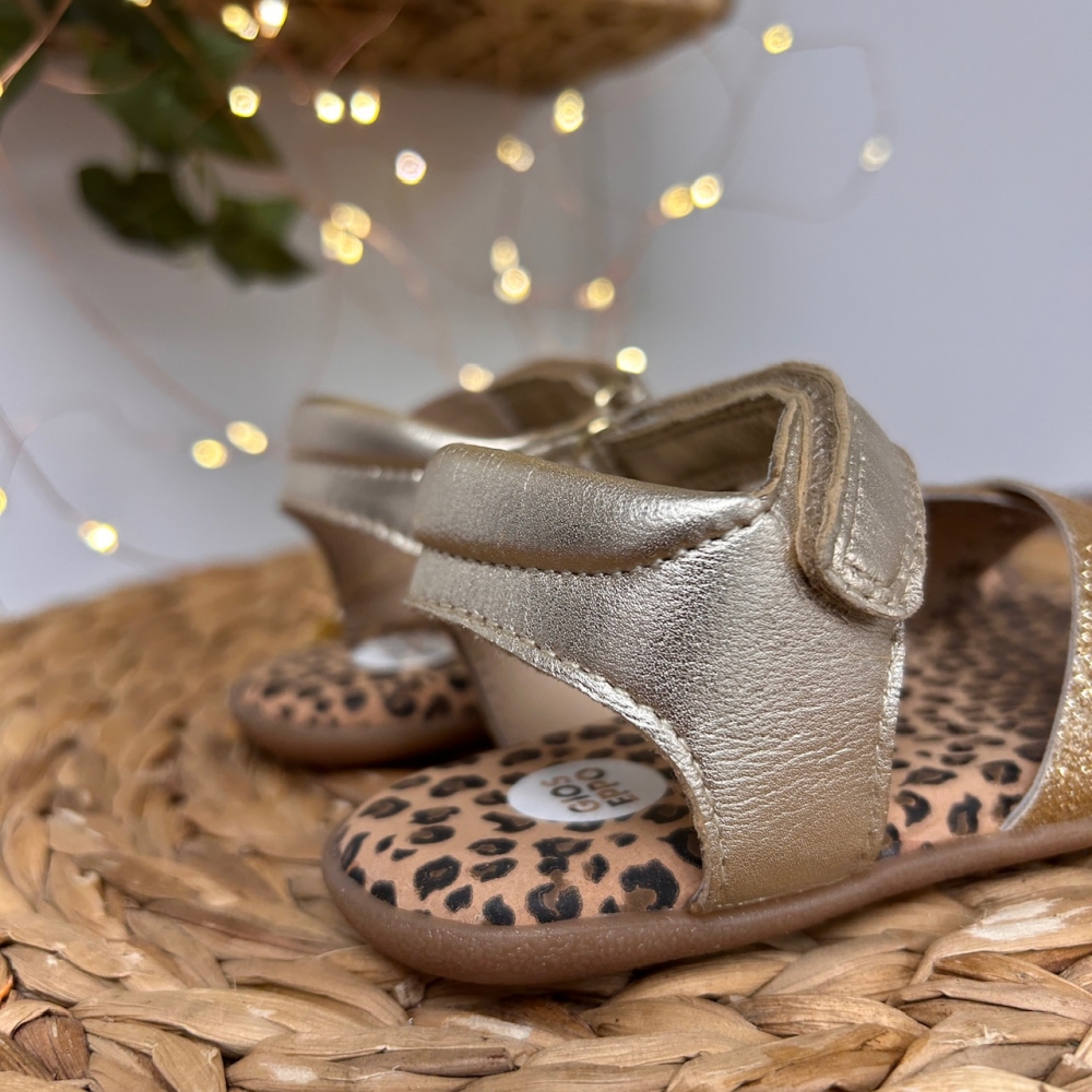 Sandalias de piel metalizada con estampado animal. Diseñadas siguiendo las tendencias minimalistas para garantizar la pisada natural. Cuentan con planta acolchada de piel y cierre ajustable en el tobillo.