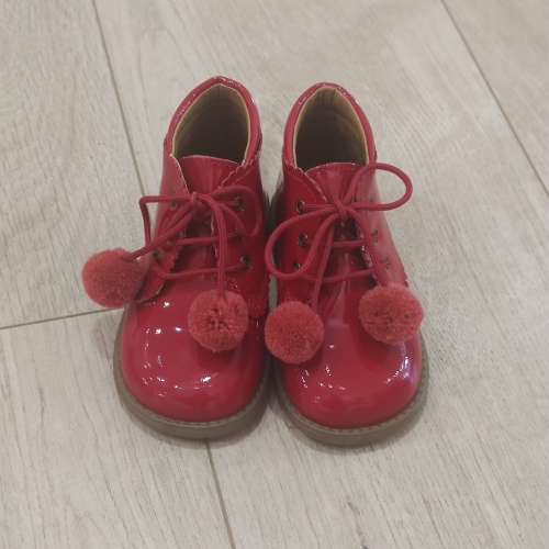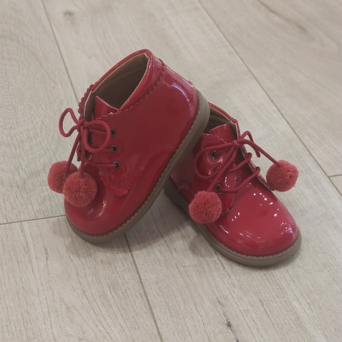 Botín realizado en charol con interior forrado en piel, cierre con cordones con pompones.