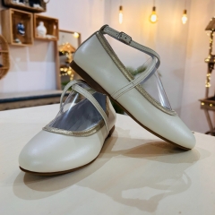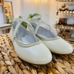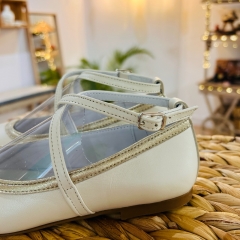 Bailarina de ante con forro en piel, dos tiras cruzadas en el empeine con cierre de hebilla lateral.