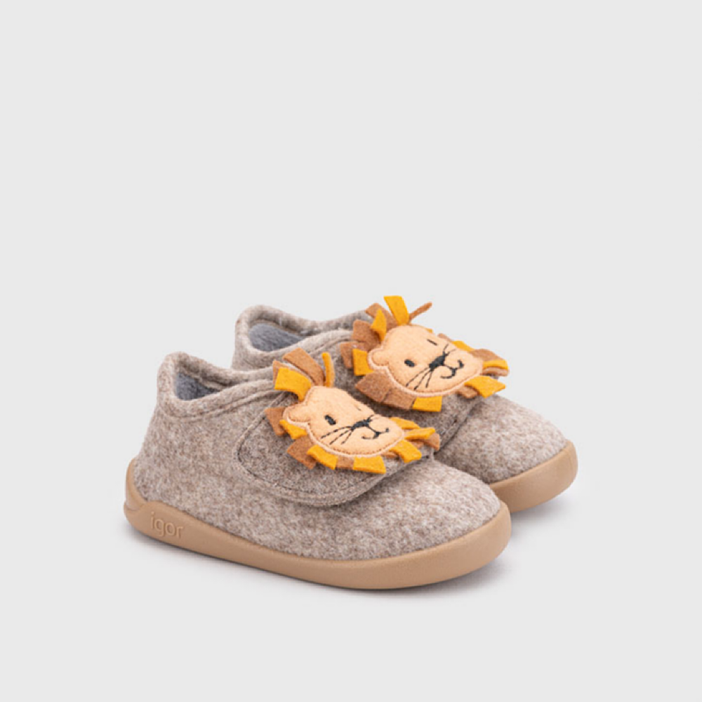 Zapatilla de estar por casa para niños y niñas con detalle de león, de concepto barefoot, cero drop, flexible y blandita, fabricada en un tejido súper blandito, calentito y suave.