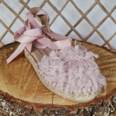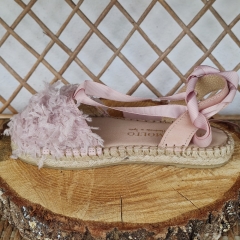Alpargata de plumas blanca con sujeción de lazo que se ata a la pierna, son muy estilosas y diferentes.
