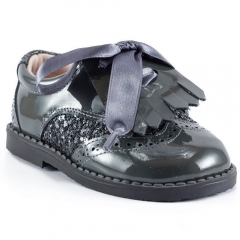 Zapato combinado en charol y laterales en glitter, realizado en piel, el fleco se puede quitar y quedaría un blucher muy estiloso, tanto para vestidos como para pantalón. Interior forrado en piel.