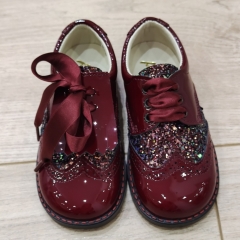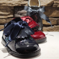 Zapato combinado en charol con detalles laterales en glitter, realizado en piel, el fleco se puede quitar.