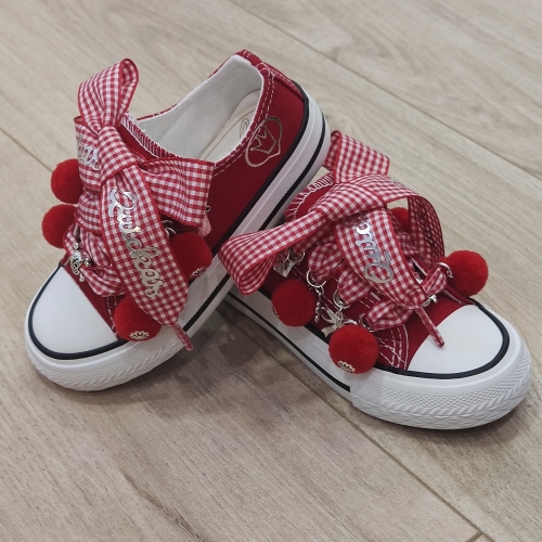Loneta de algodón con puntera, customizada con lazo vichy rojo, abalorios y pompones.