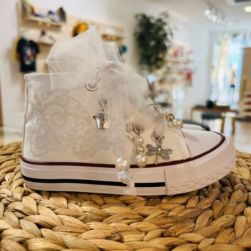 Loneta de algodón con puntera con estampado lateral diseño encaje, lazos de tul rosa.