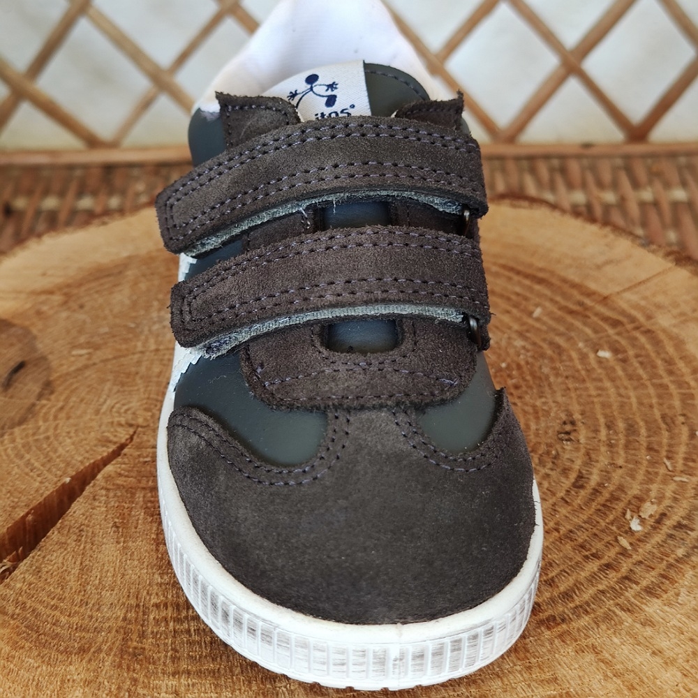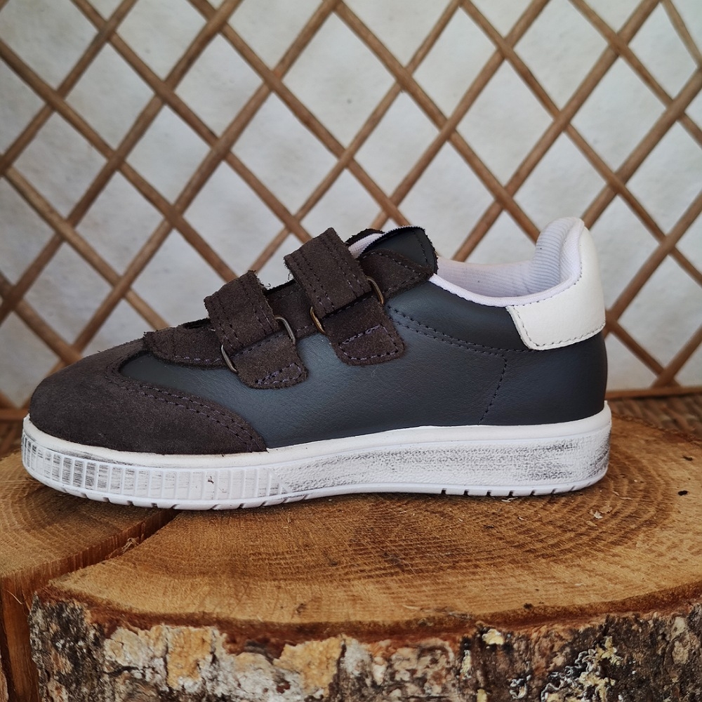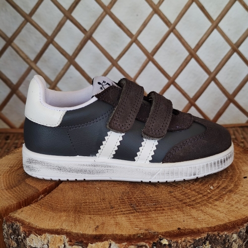 Deportiva combinada en piel con serraje, rayas blancas en el lateral exterior haciendo contraste.  Cierre con dos velcros, suela extra flexible y de efecto manchado.  Ideal para un look casual pero también nos permite ir más sport. Realizado en España