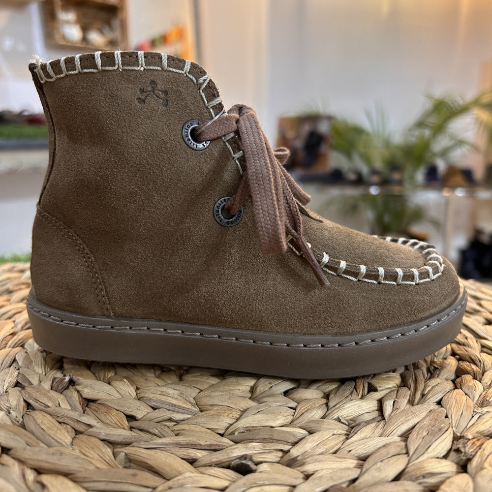 Botín piel serraje Titanitos, interior forrado en borreguito . Suela de goma antideslizante y flexible. Cierre con cordones.