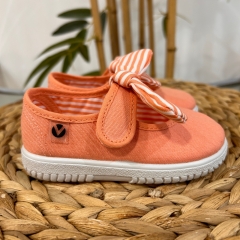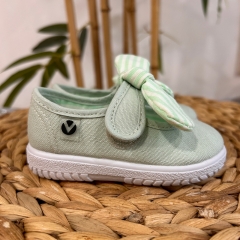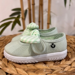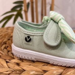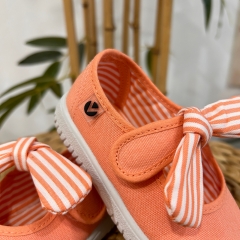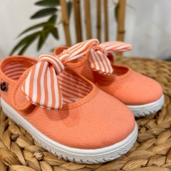 Merceditas de lona para niña fabricadas en España con algodón ecológico de alta calidad. Cierre mediante tira adherente y pañuelo de rayas extraíble que facilita el proceso de lavado, brindando practicidad y durabilidad. Su horma es más amplia por lo que asegura un calce cómodo y respetuoso. La suela vulcanizada es muy flexible y resistente.
