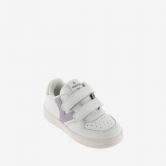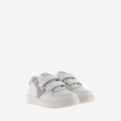 Zapatillas deportivas blancas efecto piel con el logo en el lateral en contraste con la trasera. Cierre mediante tiras adherentes que facilita su calce y autonomía a la vez que se ajustan perfectamente al pie.
