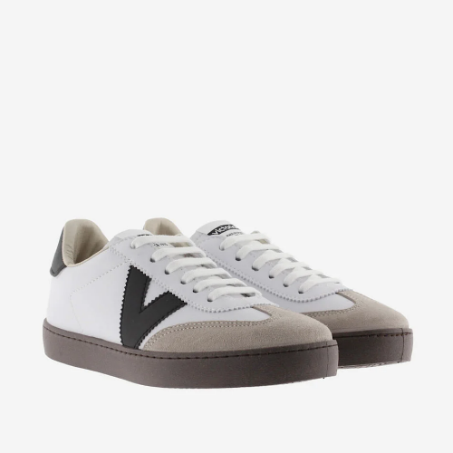 Zapatillas deportivas blancas para mujer de corte ciclista, fabricadas en material efecto piel y pieza de serraje en la puntera. Logo impreso en la trasera y V negra en el lateral al tono. Suela marrón chocolate compuesta por aceites vegetales en lugar de minerales reduciendo así el impacto medioambiental. Incluye una plantilla más ergonómica confeccionada a partir de materiales reciclados.