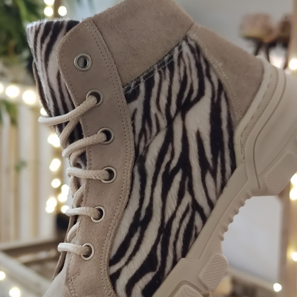 Botín con estampado cebra, cierre con cordones y suela de goma antideslizante y flexible.