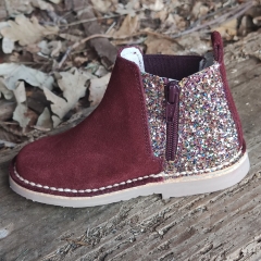 Botín realizado en piel serraje con forro interior en piel, parte trasera con adorno de glitter al tono.