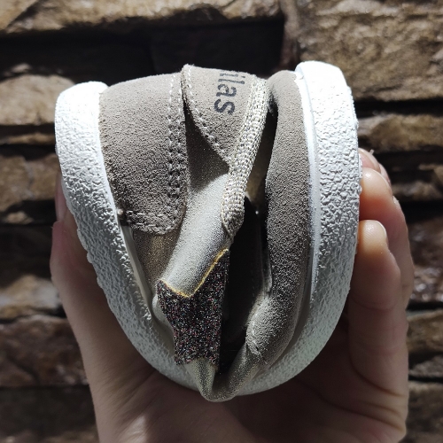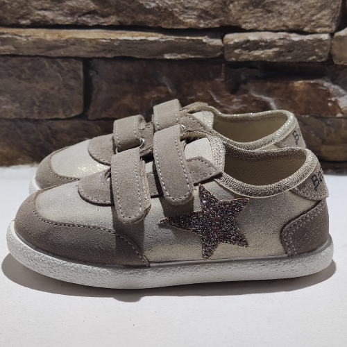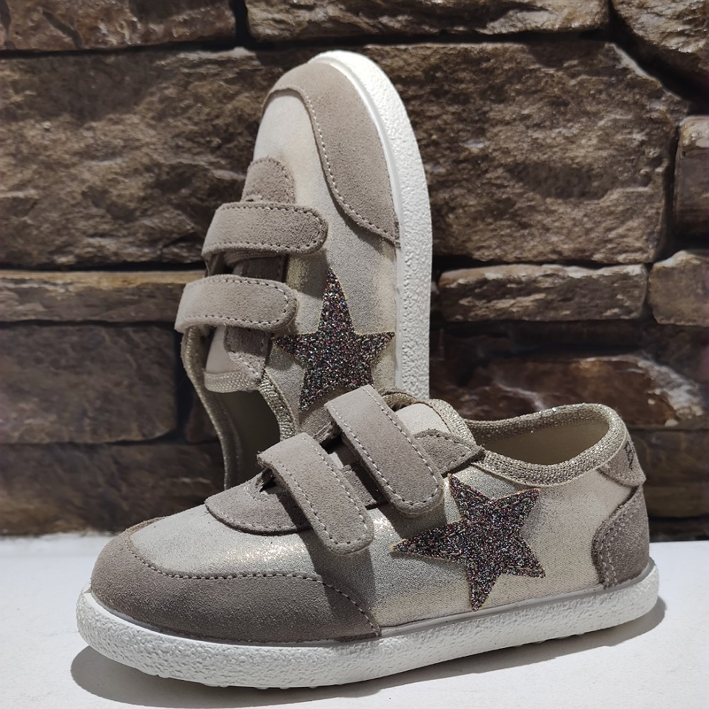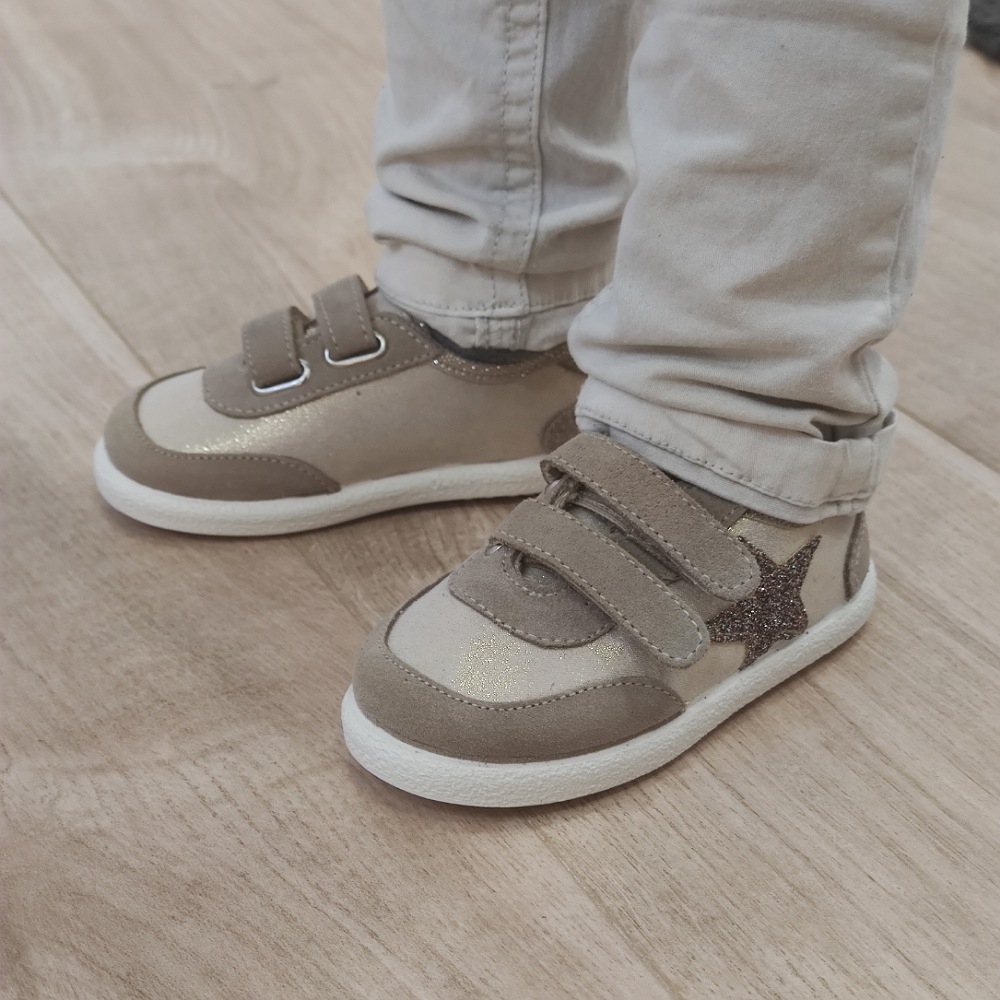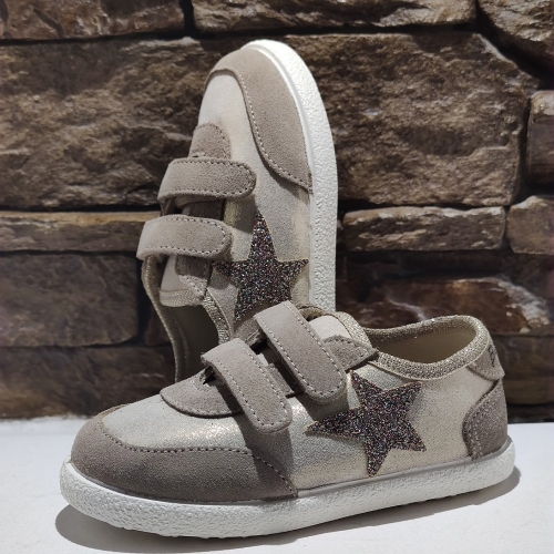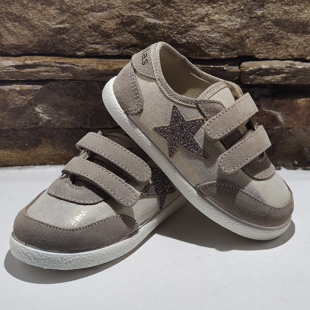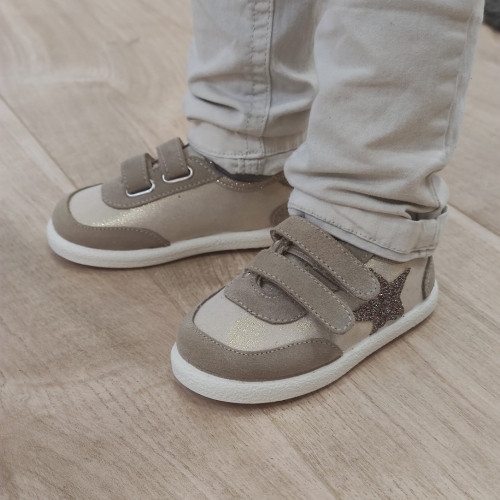 Deportiva con estrella en lateral de glitter, cierre con dos velcros para un mejor ajuste, suela de goma antideslizante y muy flexible.