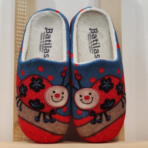 Zapatilla descalza con estampado de mariquitas, haciendo juego las dos zapatillas.