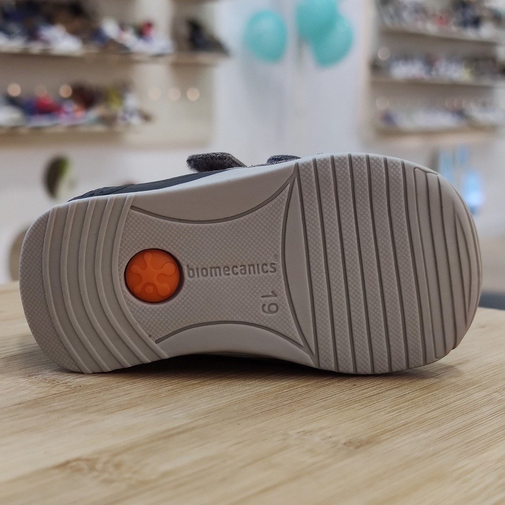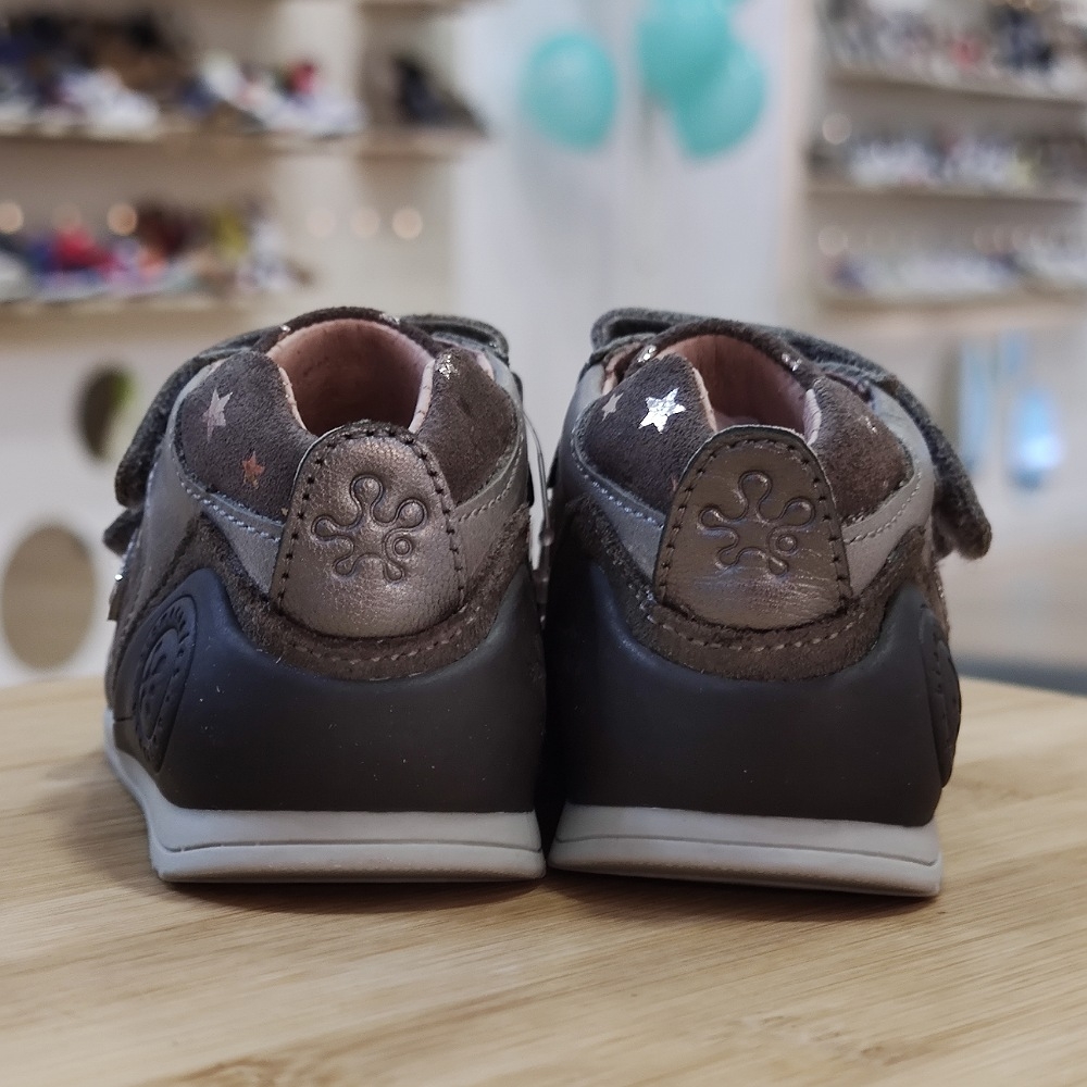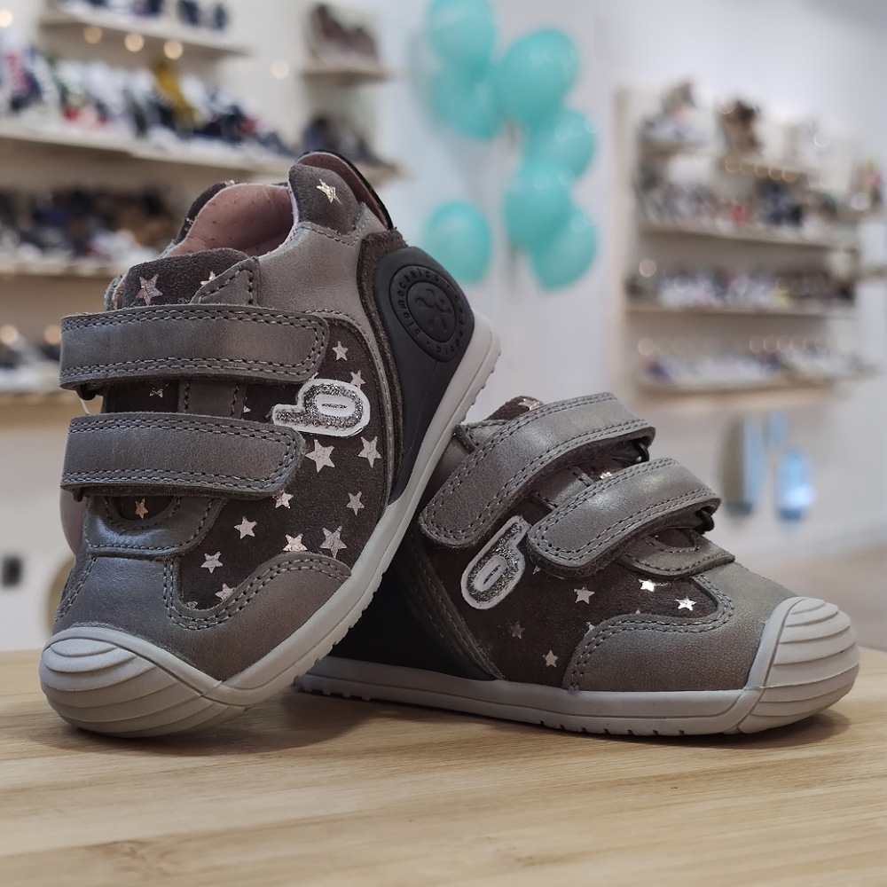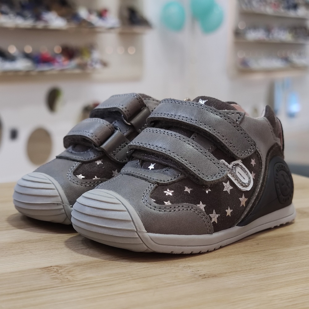 Deportiva realizada en piel, con forro  en piel perforada. Pertenece a la línea de biogateo, con estabilizadores laterales que les aportan estabilidad. El fondo es gris, combinado con unas estrellas en brillo, ideales para las más coquetas.