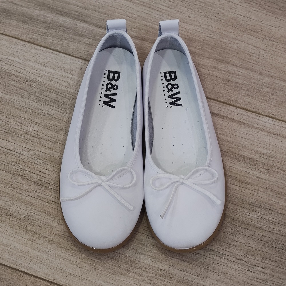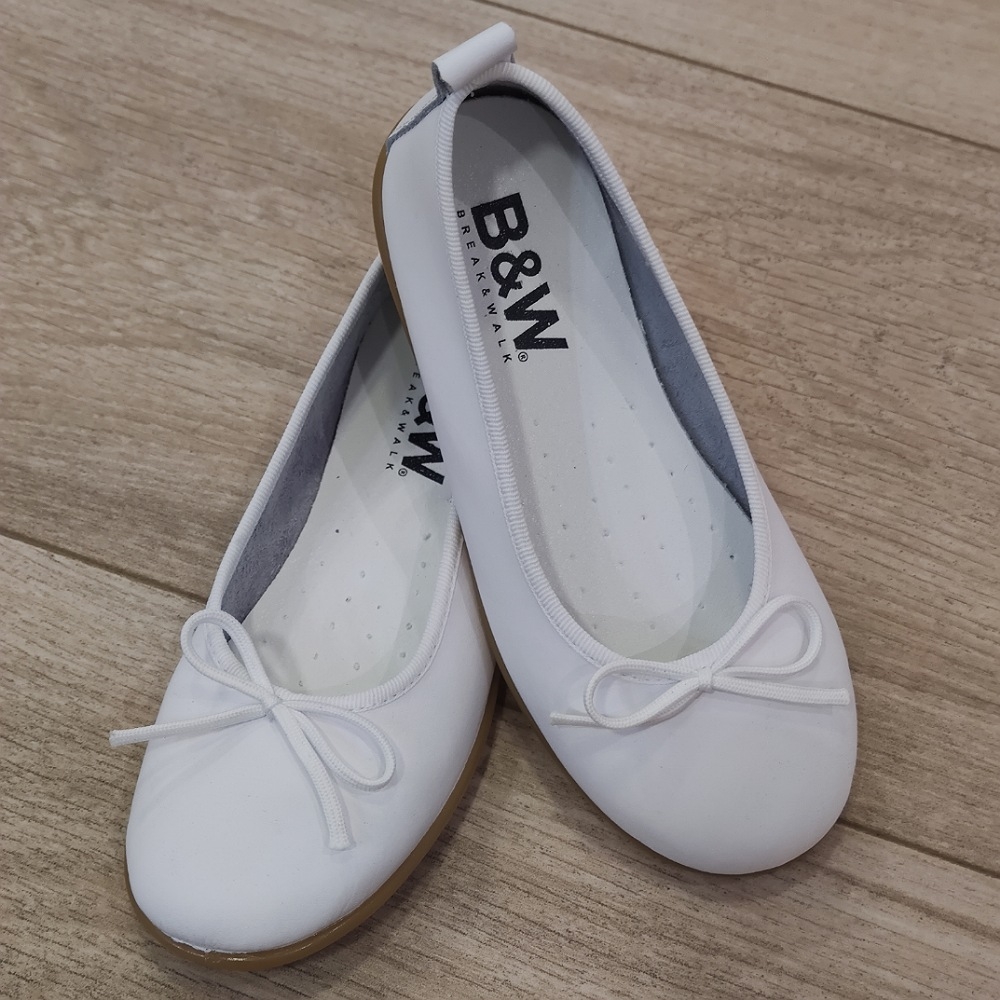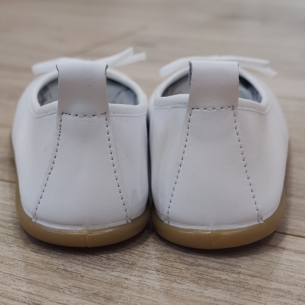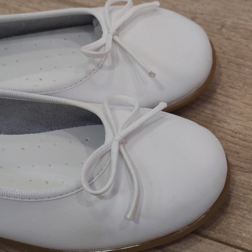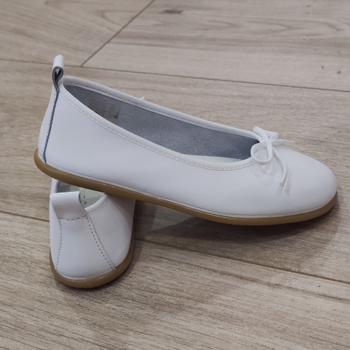 Clásica bailarina de piel en tono blanco con lazo de cordón fino en la parte delantera. Interior forrado en textil, suela antideslizante y muy flexible.