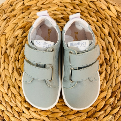 Deportiva respetuosa, suela plana totalmente flexible, horma recta y puntera cuadrada, plantilla sin elementos que interfieran, cierre de velcro para fomentar la autonomía.