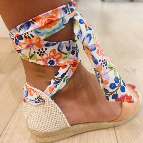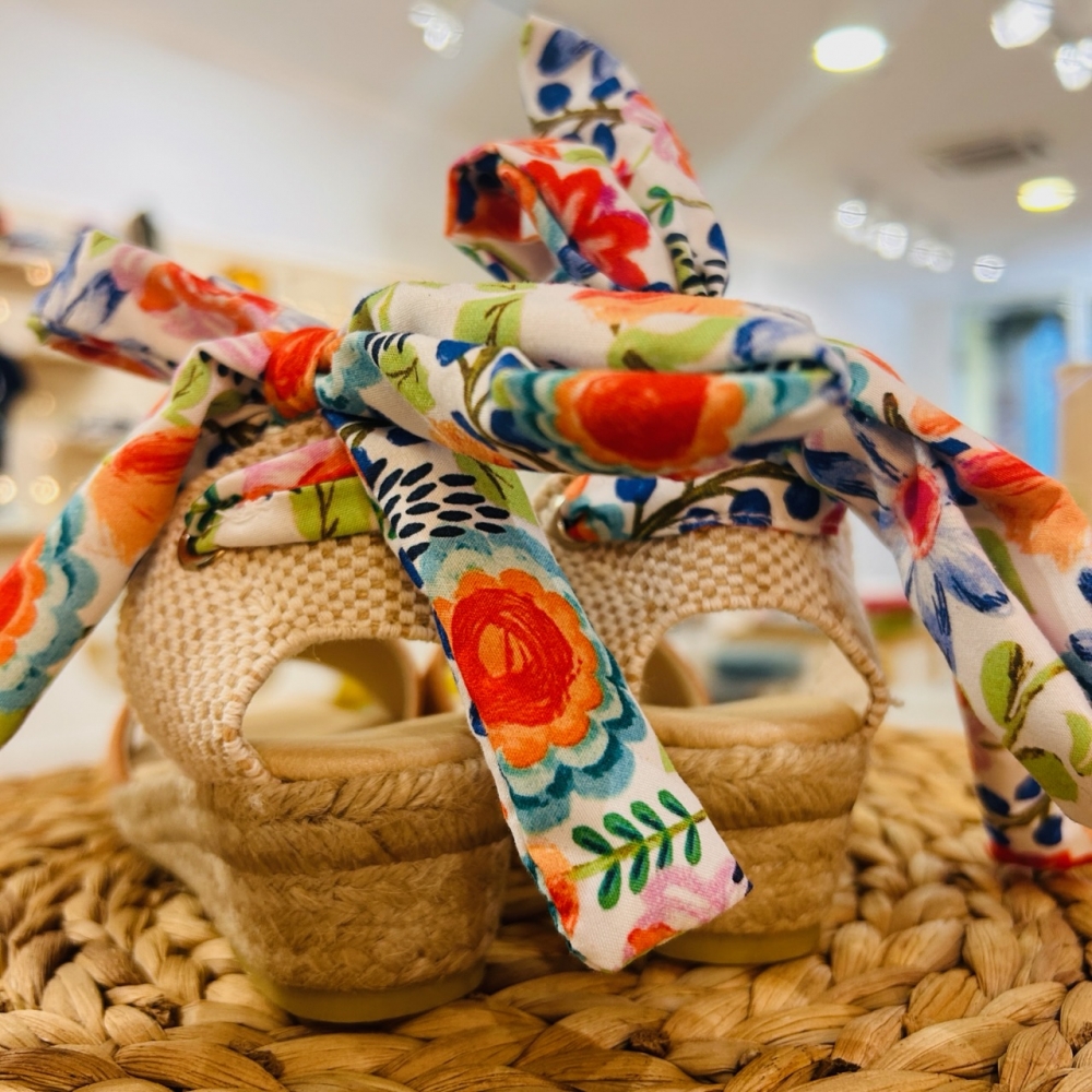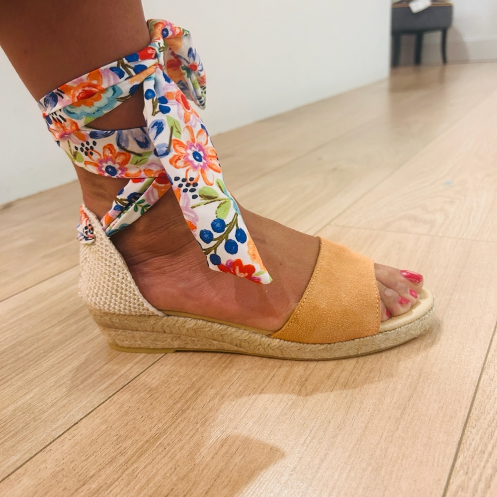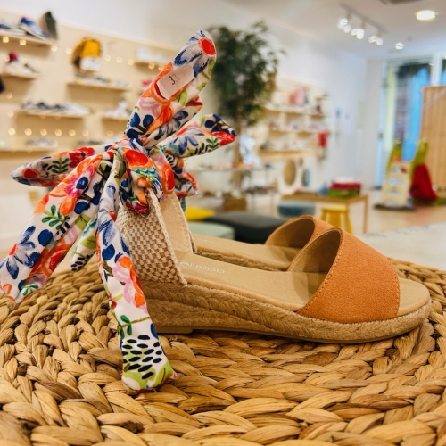 Sandalia esparto con parte delantera en serraje y trasera con lazo estampado. Suela con una pequeña cuña.