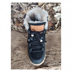 Bota realizada en piel de serraje ecológica combinada con piel brillante de calidad premium. Cierre con cordones de algodón, forro interior de piel de cordero.