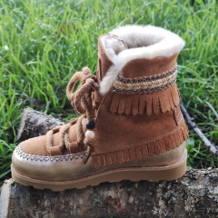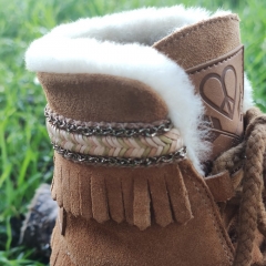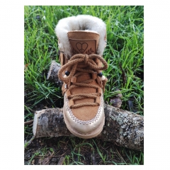 Bota realizada en piel de serraje ecológica combinada con piel brillante de calidad premium. Cierre con cordones de algodón, forro interior de piel de cordero.