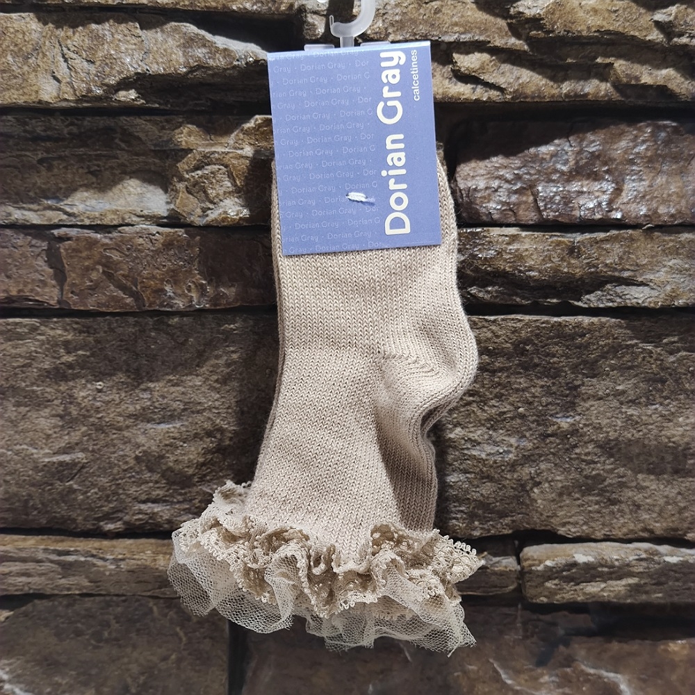 Calcetín liso de algodón con puntilla y tul en el puño. Es un modelo muy versátil ya que tanto nos encaja para un zapato arreglado como una loneta.