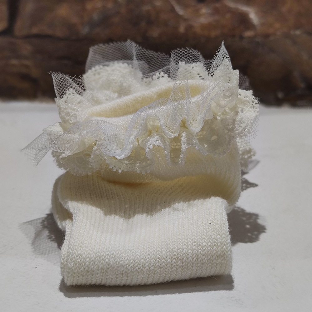 Calcetín liso de algodón con puntilla y tul en el puño. Es un modelo muy versátil ya que tanto nos encaja para un zapato arreglado como una loneta.