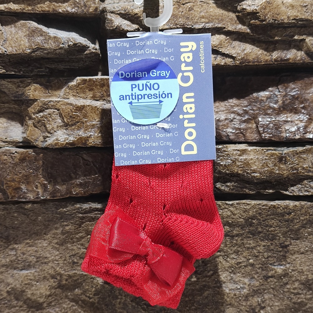 Calcetín de verano en algodón perlé fino calado, lleva un aplique en forma de pajarita superpuesta, una de raso y otra de tul.
