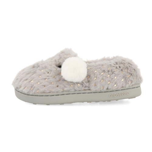 Zapatillas de casa en tono gris, lleva una cara en la parte delantera y dos pompones a los laterales, suela de goma antideslizante y muy blandita.