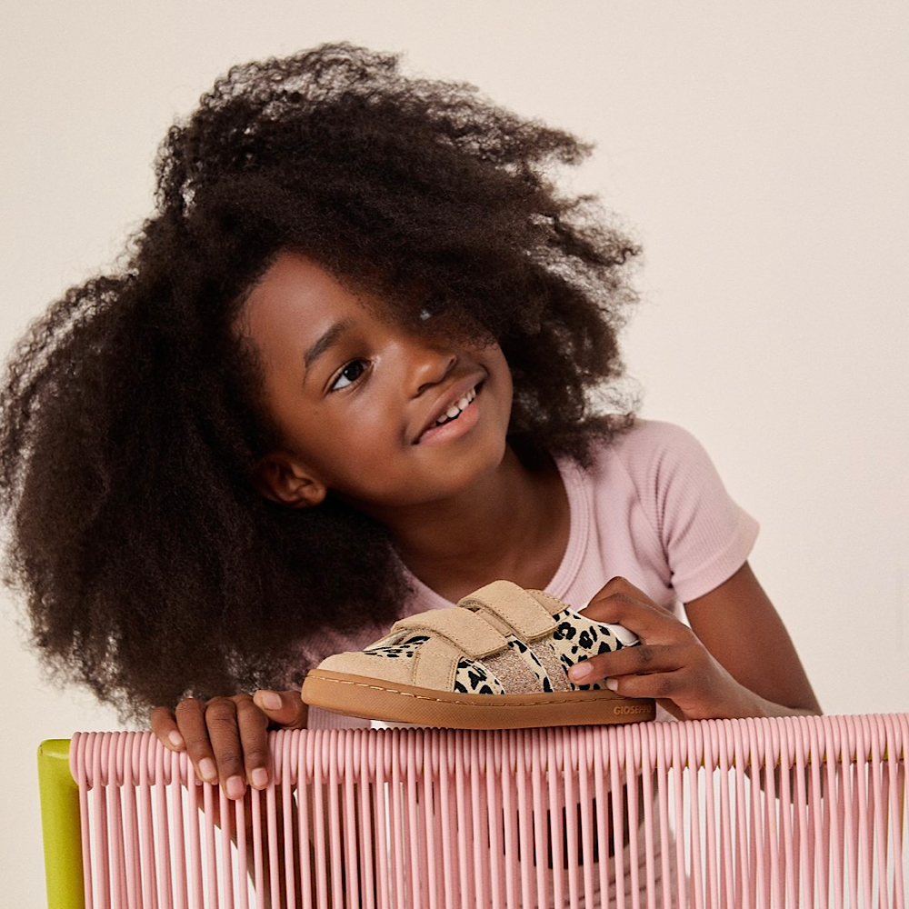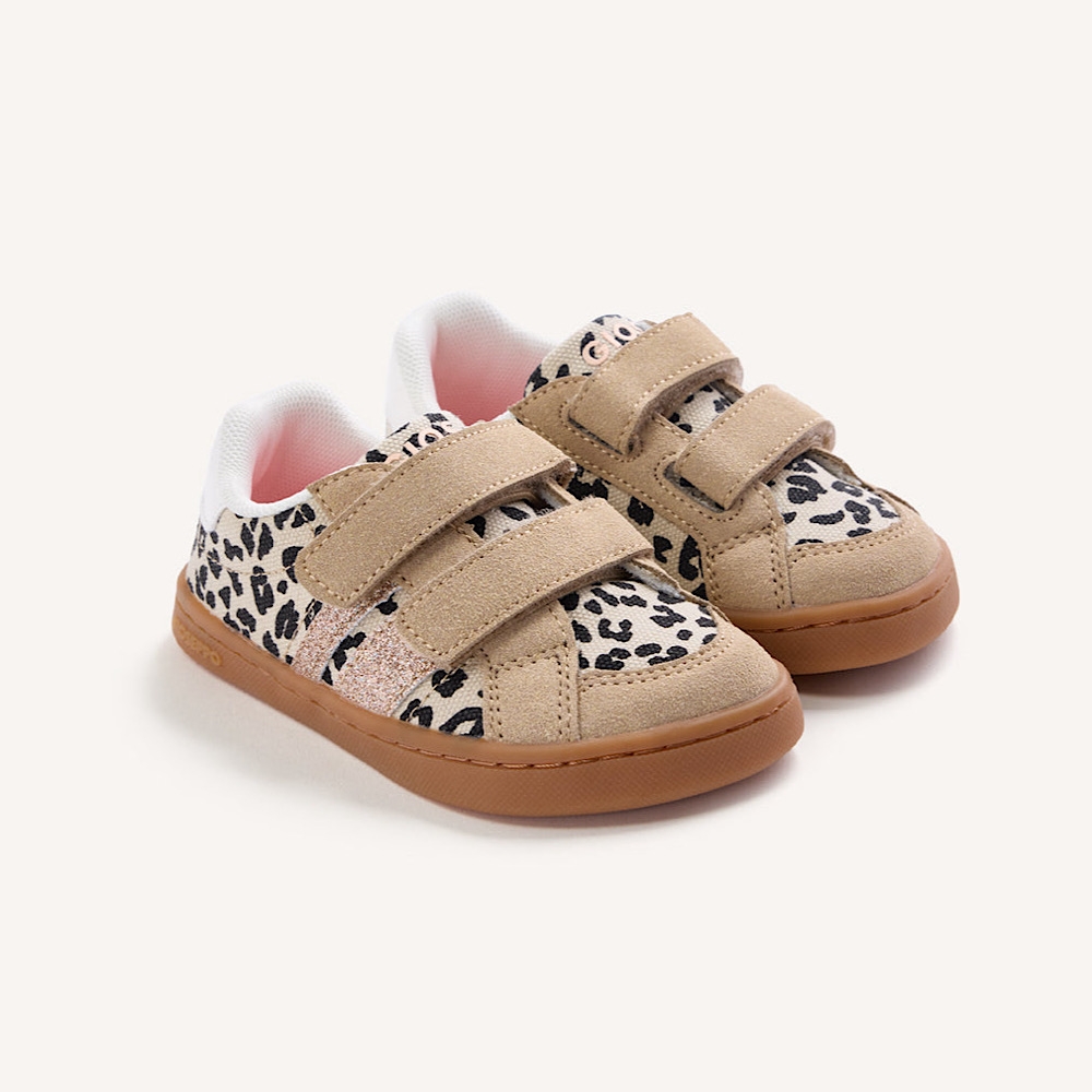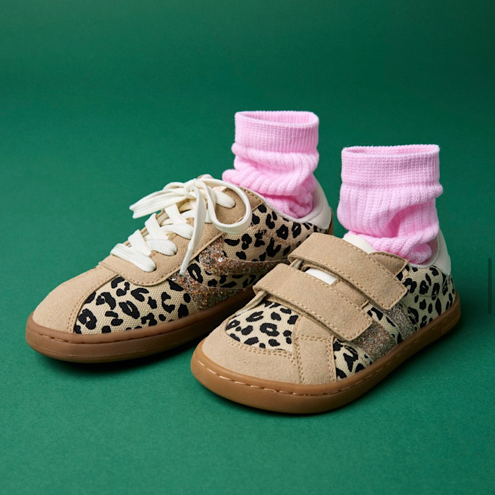 Zapatillas de lona con estampado de leopardo y detalles brillantes. Diseñadas siguiendo las tendencias minimalistas para garantizar la pisada natural. Cuentan con cierres ajustables en el empeine.