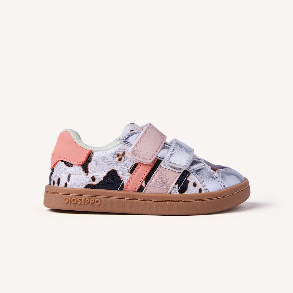 Zapatillas con estampado de vaca brillante. Piezas metalizadas. Diseñadas siguiendo las tendencias minimalistas para garantizar la pisada natural. Cuentan con cierres ajustables en el empeine.