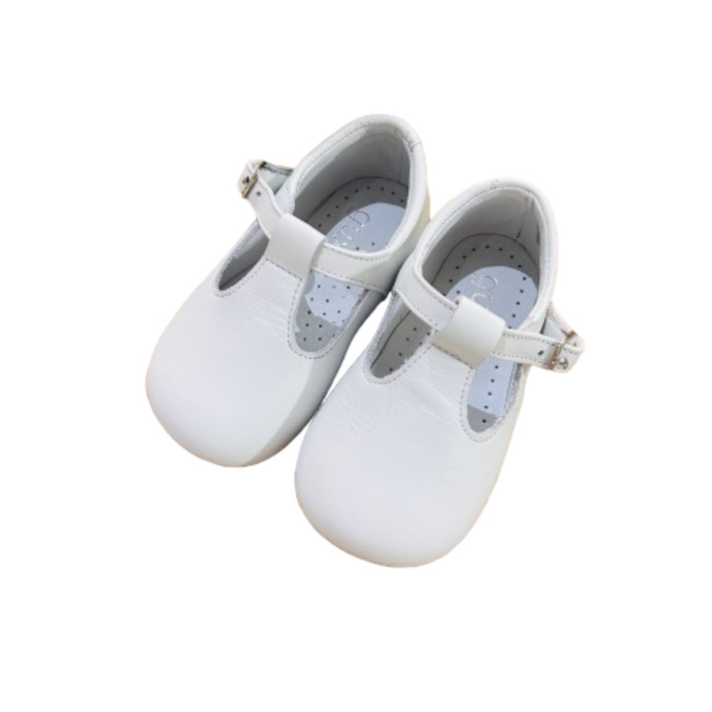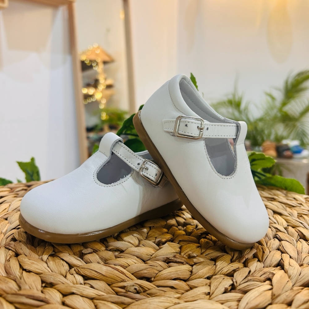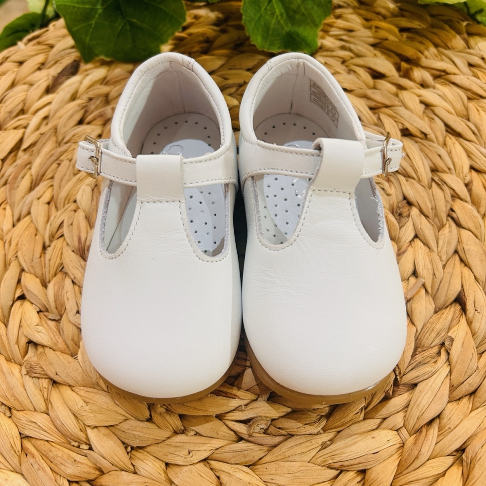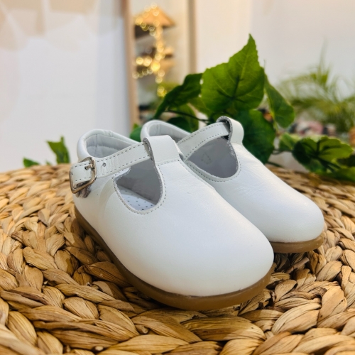 Pepito de piel, tanto interior como exterior, cierre con hebilla, suela de goma antideslizante y bastante flexible. Empeine bastante alto y puntera ancha.