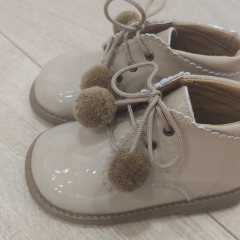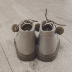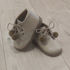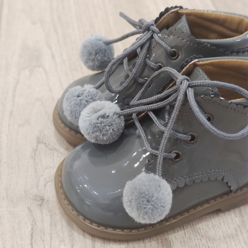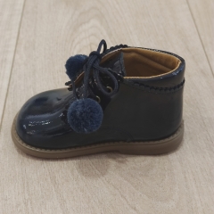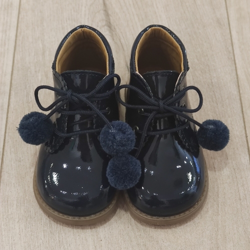 Botín realizado en charol con interior forrado en piel, cierre con cordones con pompones.