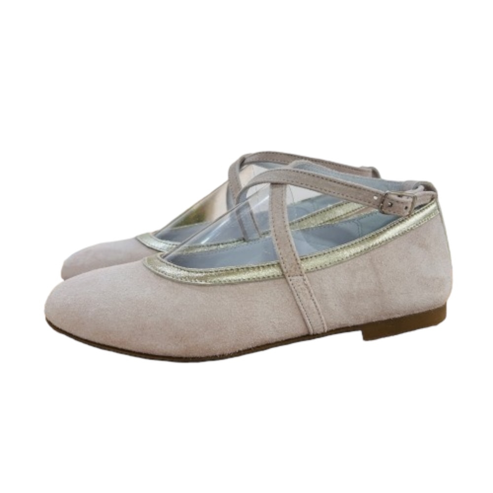 Bailarina de ante con forro en piel, dos tiras cruzadas en el empeine con cierre de hebilla lateral.