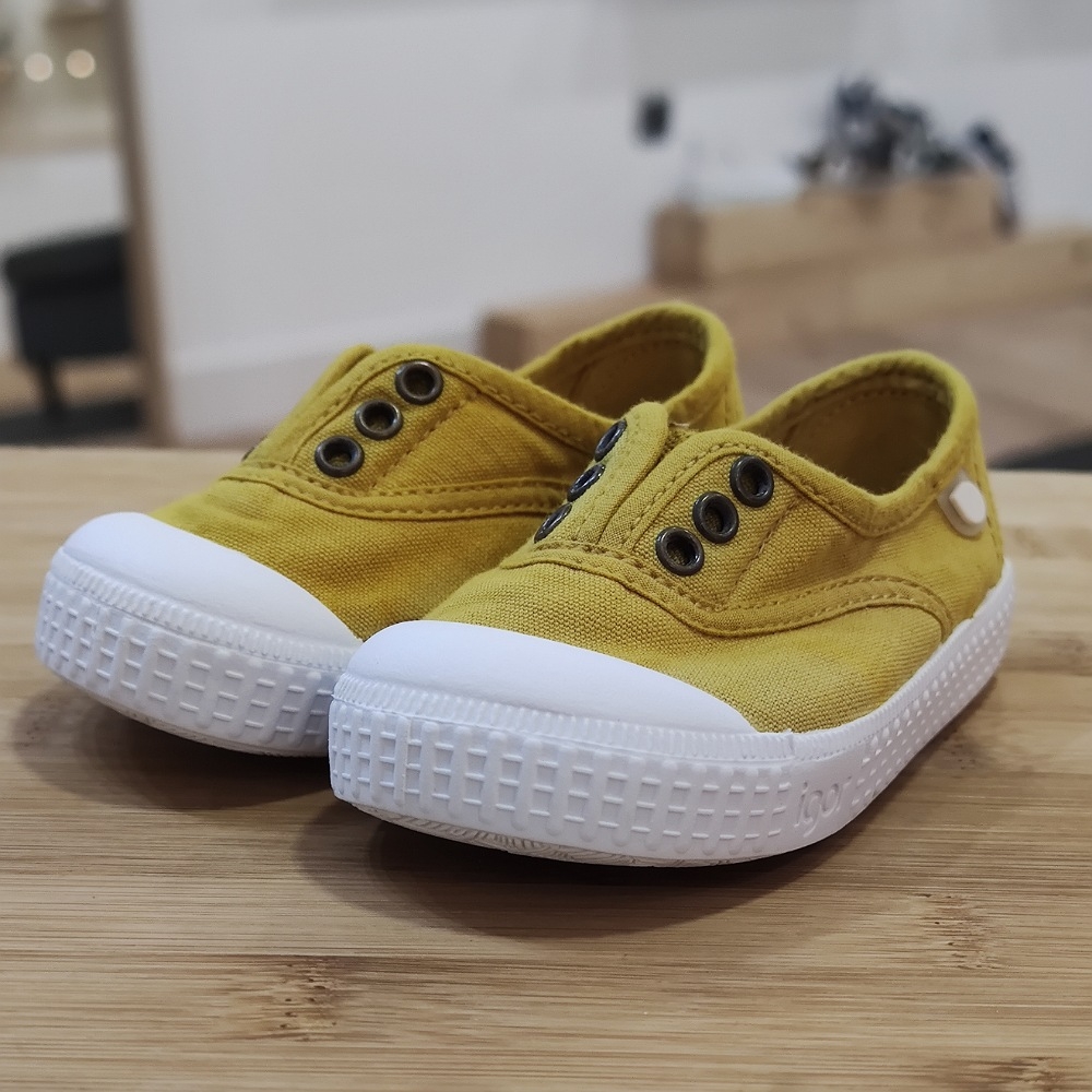 Zapatillas de lona realizadas 100% algodón, sin cordones y con goma delantera en empeine.