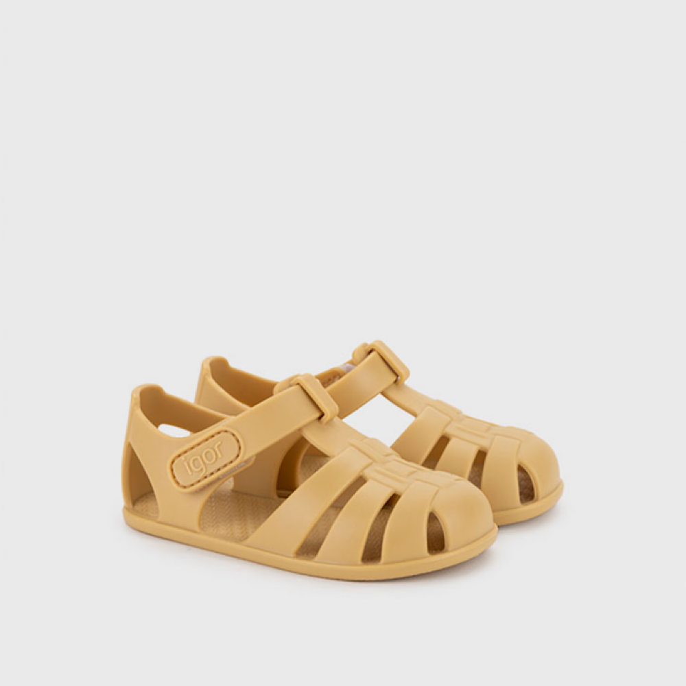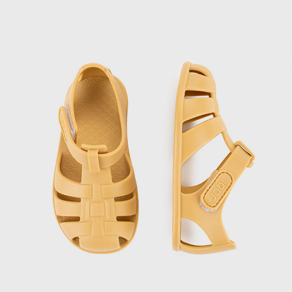 Cangrejera diseñada en concepto barefoot, cero drop, flexible y blandita, fabricada con al menos un 50% de pvc reciclado libre de ftalatos y cierre adherente.