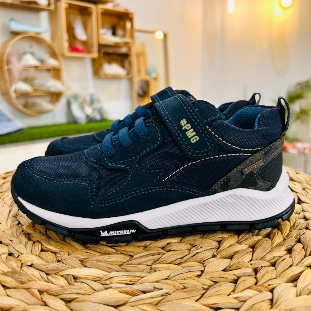 Deportiva suela michelin de la marca Primigi, cierre con cordón elástico y velcro. Goretex