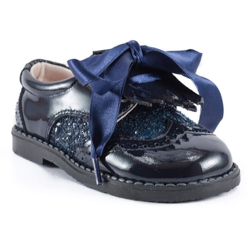 Zapato combinado en charol y laterales en glitter, realizado en piel, el fleco se puede quitar y quedaría un blucher muy estiloso, tanto para vestidos como para pantalón. Interior forrado en piel.