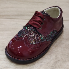 Zapato combinado en charol y laterales en glitter, realizado en piel, el fleco se puede quitar y quedaría un blucher muy estiloso, tanto para vestidos como para pantalón.