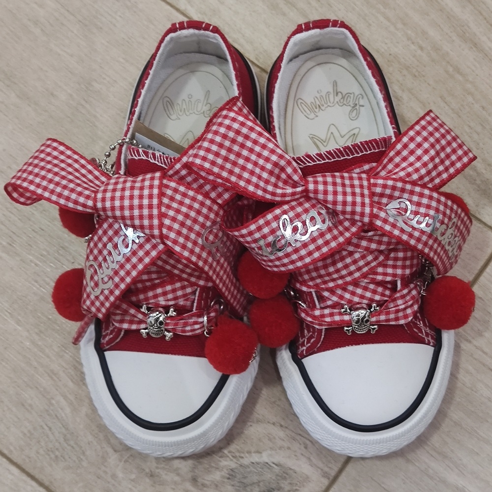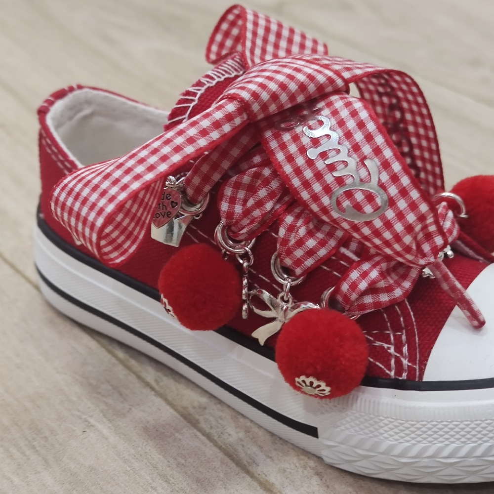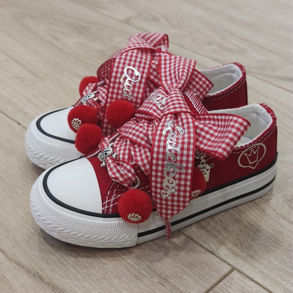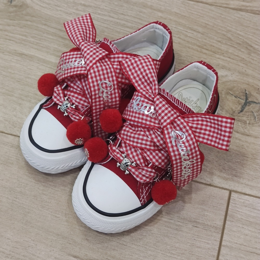 Loneta de algodón con puntera, customizada con lazo vichy rojo, abalorios y pompones.