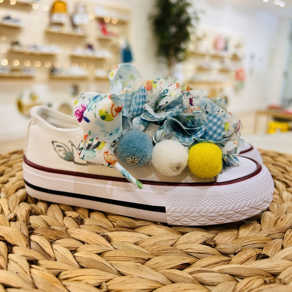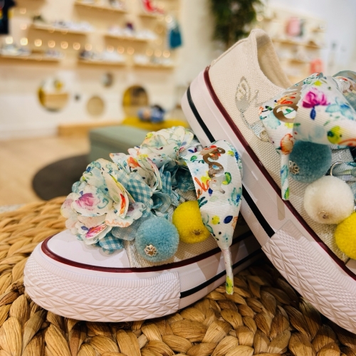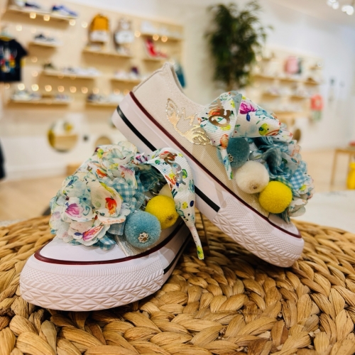 Lonetas con puntera y suela de goma, con lazos y abalorios con pompones, trabajo y estampado realizado a mano.