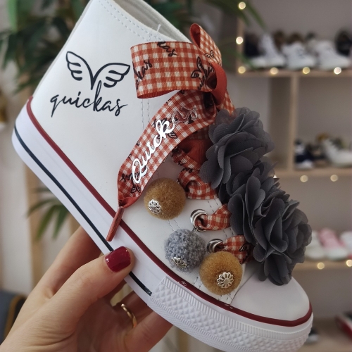 Botines de polipiel, con abalorios en tonalidades gris y naranja.